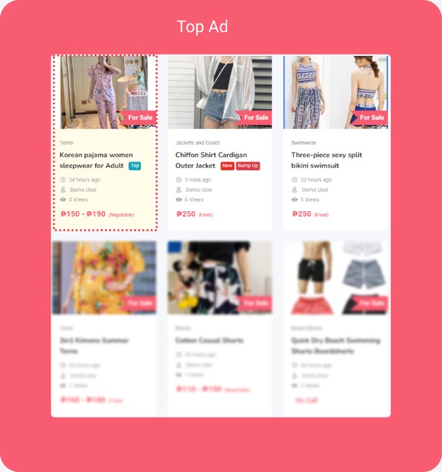| Featured Ads | Featured ad will be prominent in the designated area with a featured icon in left, however, the visibility also depends on demand for the product, (e.g: the users are interested in the product or not.) |
